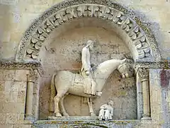El muro lateral norte se distingue por sus esculturas. Un caballero en alto relieve, en el interior de un nicho, simbolizaría la victoria de Constantino I sobre los paganos, y corona la representación, en el rodillo exterior del arco, del combate de los vicios y las virtudes. La escultura actual proviene principalmente de una restitución de 1872, ysolo la parte central es auténtica. Esta escena no es única ya que está en las fachadas de otras iglesias en la región: Aivault, Parthenay-le-Vieux, Civray, Aulnay-en-Saintonge. Hay una puerta clausurada en el transepto, su dintel es una piedra reutilizada de origen galorromano, en la que aún se puede ver un medallón con una pareja en busto.