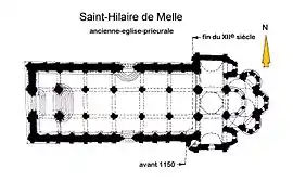 Nombrada por san Hilario (315-367), primer obispo de Poitiers, esta iglesia, la más grande de Melle, también es la única que aún se utiliza como lugar de culto. Según una carta del siglo X, la iglesia dependía del priorato benedictino de Saint-Jean-d'Angély y probablemente fue entregada a la abadía en el año 961 por Guillaume Tête d'Étoupe, conde de Poitou. Originalmente la iglesia era de madera. Fue reemplazado en el siglo XII por el edificio actual. Este último fue construido en dos etapas: alrededor de 1109 (fecha del depósito monetario más reciente enterrado debajo de la iglesia) para el coro y el crucero, y alrededor de 1150 para la nave y la fachada. La construcción habría sido financiada por un tal Aimericus Abelini, cuyo nombre se encuentra en el ábaco de un capitel del deambulatorio.[1]