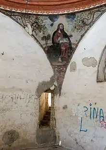 El edificio es de construcción sólida con muros gruesos y bóveda en ladrillo. La nave, de más de treinta metros de longitud, es el recinto de mayor amplitud y tiene tres sectores: el vestíbulo de ingreso bajo el coro, la zona de reunión y el presbiterio. En el sector del presbiterio el retablo, tallado en madera, ha desaparecido luego de ser destruido por un terremoto; sus piezas fueron retiradas y no hay vestigios de las mismas. Bajo el presbiterio se halla la cripta a la cual se ingresa por una gradería dando lugar a un espacio abovedado en cuyas paredes se encuentran los nichos. A su vez el presbiterio es flanqueado por dos recintos que conformaban la sacristía y el almacén. La primera de ellas está flanqueada por una cúpula en la cual aún se distinguen las pinturas de los cuatro evangelistas.