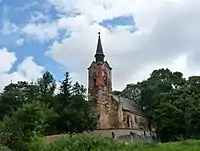 La iglesia, compuesta de piedra de mampostería,[2] fue construida en el siglo xiv, concretamente hacia el año 1352,[3][4] aunque al parecer hay datos que aseguran la existencia de la misma ya en el siglo xiii[2] (también se afirma erróneamente que el templo fue levantado en el año 920 por el príncipe Bratislao I de Bohemia, que fue reconstruido a causa de un incendio en 1142 y que quedó abandonado tras la Segunda Guerra Mundial,[5] lo que constituye una confusión con la Basílica de San Jorge de Praga). Destruida durante las guerras husitas y reparada en el siglo xvi, la iglesia resultó devastada en un incendio en el siglo xvii, tras lo cual fue reconstruida en estilo neogótico, añadiéndosele una torre.[2] En 1968, durante la celebración de un oficio religioso con motivo de un funeral,[1] el techo y parte del tejado del templo se derrumbaron,[3] acontecimiento que fue interpretado por los feligreses como un mal augurio, lo que motivó que se dejase de celebrar misa en el interior del edificio y se optase por llevar a cabo los actos litúrgicos en el exterior. Con el tiempo, la iglesia, considerada maldita,[6] fue quedando abandonada, situación que el comunismo aprovechó para expoliar el santuario, llevándose, entre otros objetos de valor: pinturas, estatuas, la campana y el reloj del templo, resultando el órgano dañado.[7] Posteriormente se acometieron diversas labores de mantenimiento destinadas a impedir un mayor deterioro, como el arreglo de la torre y la sacristía además de una reparación temporal del techo.[2]