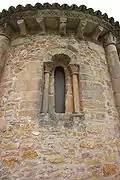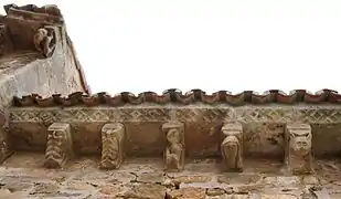 Otros elementos que vinculan la iglesia a esas corrientes foráneas del románico son los rasgos decorativos presentes en determinados espacios del templo, caso de la portada, con su taqueado jaqués los dientes de sierra o sus motivos en zigzag, el arco de triunfo con un capitel en el que se desarrolla un limitado repertorio iconográfico y, sobre todo, varios de los canecillos presentes en su ábside, que incluyen figuras humanas y animales.