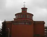 - Cubierta izquierda: Parte visible de la nave secundaria septentrional, está decorada con un pequeño tambor cilíndrico rodeado de pequeñas vidrieras y con un tejado cónico rematado por una cruz de metal negra semejante a la que remata la torre. Es la capilla del Monumento y en el año 2007 fue estrenada una imagen de Jesús Resucitado para el centro de la pared principal.