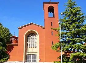 - La torre: Esbelta, mide unos 30 metros y está levantada solamente con ladrillos. Se presenta como una atalaya sobria, la imagen típica de la torre de una iglesia. Es cuadrangular, tiene un chapitel piramidal tejado y rematado por una cruz. En su parte alta se abre un gran ventanal en el cual se encuentran las campanas. Más abajo sólo adornan la pared tres ventanas estrechas situadas cada una bajo la otra.