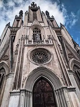 El templo cuenta con varios elementos decorativos: arcos ojivales y torales, archivoltas, triforios, vitrales y un rosetón. En su interior discurren bóvedas de crucería, florones, agujas, columnas fasciculadas, polilobuladas, capiteles, bases y ventanales góticos con vitrales.
