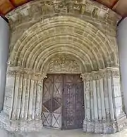 El elemento más destacado de la iglesia es el tímpano decorado de la portada, elemento muy raro en la arquitectura románica de Asturias. Representa a Cristo en Majestad impartiendo la bendición y rodeado del tetramorfos que representa a los cuatro evangelistas, el león de San Marcos, el águila de San Juan, el toro de San Lucas y el ángel de San Mateo. La escena la completan dos ángeles que sobrevuelan la escena.