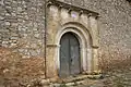La fábrica de la iglesia es de nave única rematada en cilindro absidial con la torre adosada al norte. La cabecera del templo, ábside y presbiterio, se rematan con cornisa lisa y canecillos lisos con perfil de nacela. La puerta se abre en el muro sur y se compone de dos arquivoltas que apean por medio de imposta corrida en jambas rectas sin decoración. Hay un ventanal en el presbiterio sur, adintelado, moderno, probablemente de la misma fecha tardía en que se adosó al edificio la sacristía al norte.