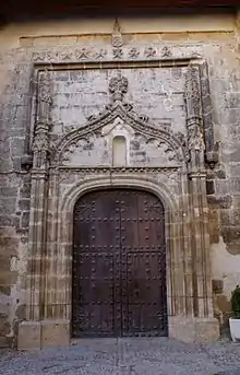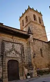 Su portada principal se abre sobre el muro norte, contando con otra portada en el muro sur; esta última está precida por un amplio atrio descubierto rodeado por barbacana de sillería. Ambas puertas son de principios del siglo XVI, con arcos conopiales poco apuntados incluidos en hornacinas amplias y cobijadas por aleros pronunciados, con detalles ornamentales góticos y algunos escudos propio de la Orden de Calatrava, dueña de la villa y patrocinadora de la iglesia. Ambas presentan puertas de madera tachonada.[1]