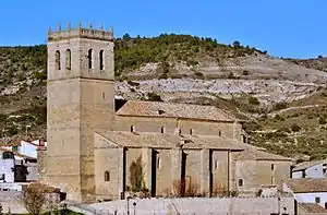 El ábside, orientado hacia el este, es semicircular, con contrafuertes adosados y sobre un fuerte muro semicircular levantado. La torre se yergue en el lado opuesto; es cuadrada, construida en la misma época, y de sencilla factura. Consta de dos cuerpos separados por una línea de imposta y se remata con una especie de cornisa orlada de pináculos, está construida con sillería.[1]