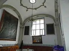 Sencilla, decorada con pinturas virreinales, y muros blancos, 2 bóvedas con linternilla, decoradas con chapa de oro, así como muebles con detalles franciscanos, 3 credencias y una mesa con Acetres.