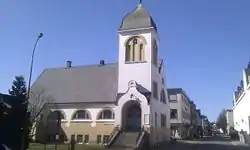 El edificio fue construido entre 1916 y 1918 en el estilo Art Nouveau de los metodistas, y fue inaugurado el 5 de marzo de 1918. El edificio de la iglesia fue por noventa años una parroquia protestante de los metodistas[2] en la ciudad, pero fue vendido a la Iglesia Católica en el 2008.