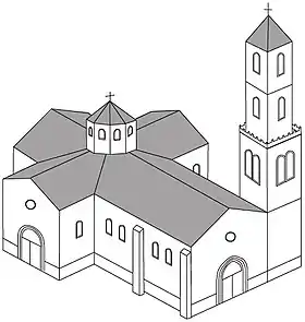 ![]() Recreación hipotética de la iglesia para principios del siglo XIX, basado en un dibujo de De Retz de 1800. | ||