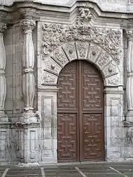 De esta época (hacia 1730) data la fachada principal, sin duda lo más interesante del edificio. Está trazada por Matías Machuca y es quizás el mejor exponente del Barroco dieciochesco en Valladolid. Está orientada hacia el Parque del Campo Grande y posee una planta muy movida, con acusadas convexidades y concavidades, lo que genera gran dinamismo. Los cuerpos laterales, cilíndricos, decorados con numerosas pilastras cajeadas que cubren toda la superficie, se coronan con sendos templetes para las campanas. El cuerpo central tiene dos pisos. En el bajo, se dispone la puerta, con arco de medio punto, que muestra una importante decoración a base de rocallas y motivos vegetales en las dovelas y las enjutas. Este primer piso se flanquea con dos pares de columnas de fuste bulboso y formas blandas. Las basas están esculpidas de manera que están deformadas, como si se estuvieran derritiendo, lo que contribuye a dar dinamismo a la fachada, emparentándola con el Rococó. En el piso segundo, se dispone, también flanqueado por dos pares de columnas bulbosas como las del piso bajo, el escudo real de España (debido al patronato real), rodeado de una abigarrada decoración en la que se encuentran motivos vegetales, angelitos y trofeos de guerra, con cañones, lanzas o morteros. Se remata con un templete en el que se aloja una buena escultura de San Juan Bautista, flanqueado por la Fe y la Caridad.