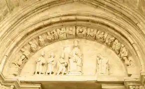 En el tímpano se representa una Epifanía, con la Adoración de los Reyes Magos, situando en el centro a la Virgen con el Niño en brazos, a la izquierda los reyes en actitud de ofrenda y, por último, a la derecha a San José dormitando apoyado sobre un bastón.