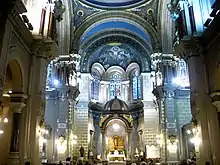 Tiene planta de cruz latina de una nave, con capillas laterales y una gran cúpula sobre pechinas y cimborrio, recubierta externamente de azulejos rojos. La cabecera y el transepto rematan en ábsides poligonales. Toda su fábrica es de primorosa cantería de piedra rosa y blanca, con profusión de pináculos, molduras y capiteles. La fachada, en forma de hastial, ostenta un enorme ventanal de tres cuerpos sobre la portada, y está flanqueada por dos torres, coronadas por templetes que albergan las campanas. Los espléndidos vitrales, realizados por la casa Maumejean, son de inspiración gótica.