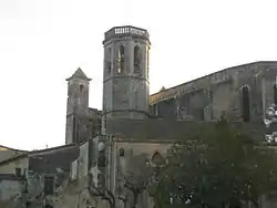 La torre campanario se encuentra adosada a la capilla gótica izquierda, está formado por cuatro cuerpos separados por cornisas. El primer cuerpo es de estructura cuadrangular y de estilo románico. En su interior hay una capilla románica de bóveda de cañón. Los otros tres cuerpos son de estructura ochavada. Destaca el cuarto piso, que presenta ocho ventanas de ojiva que contienen las campanas, y está rematado por una cornisa con barandilla de balaustres de piedra.[2]