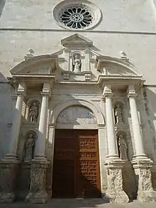 Iglesia de una sola nave (40 x 12 metros) con seis capillas laterales por lado, presentan un arco de medio punto y bóveda de cañón. El ábside es pentagonal y detrás está la capilla del Santísimo. La bóveda principal, de tradición gótica, está sostenida por arcos semicirculares y compuesta por cinco bóvedas de crucería con nervios y clave decorada, que se apoyan sobre una cornisa, bajo la cual podemos ver un friso con triglifos y metopas. Las paredes laterales de las bóvedas tienen una serie de ventanas de arco de medio punto tapadas con vitrales. A los pies de la iglesia, y bajo el coro, sostenido por un arco rebajado, se encuentra el cancel. En la fachada principal destaca la gran portada del templo, compuesta de cuatro columnas de fuste liso que sostienen un friso. Sus intercolumnios presentabann unas hornacinas vacías, donde se han colocado unas esculturas representando santos de devoción. El tímpano es semicircular y tiene en medio una hornacina sostenida por dos pares de ménsulas. Sobre la portada se muestra un rosetón y a cada lado de la fachada hay dos torres cuadrangulares de 28 metros de altura, una tiene el reloj y la otra matracas.[2]