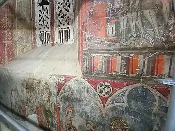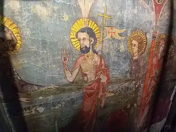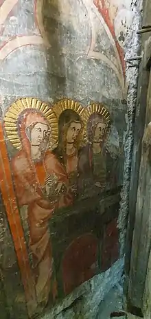 En cuanto a las representación del mural, en la primera banda, la inferior, se presentna siete escenas de la Pasión y Resurrección de Cristo: en el paño de la izquierda, ante Herodes (donde Cristo debería aparecer en una zona perdida), la Flagelación (muy deteriorada); en el paño central, Camino del Calvario, Crucifixión (muy deteriorada) y Santo Entierro (bien conservada); en el paño de la derecha, en buen estado de conservación, la Resurrección, y las Tres Marías.[22] En la banda situada sobre esta primera aparecen seis escenas de la Navidad y ocupado el lugar central la decoración de un ventanal gótico, que sobrepasa la altura de las escenas. En el paño de la izquierda se inicia con la escena, muy perdida, de Herodes recibiendo a los Reyes Magos; a continuación la adoración de los Reyes al Niño, del que solo se conserva la imagen de la Virgen con el Niño, y la cabeza de uno de los reyes, en el paño central, a la izquierda del ventanal solo quedan unos restos con parte de un caballo, una corona, un personaje con una espada -quizá el regreso de los Reyes Magos-; sigue a continuación la decoración interior de la ventana situada en el eje del templo, ella queda cubierta al interior con una celosía de estuco[23]; a la izquierda de la ventana se representa la matanza de los Inocentes, y aunque con cierto deterioro se ven con claridad la figura de Herodes, soldados, un niño atravesado por la espada y su madre; la última escena, en el extremo derecho, presenta al Niño Jesús bendiciendo a tres niños que parecen precipitarse sobre el suelo, posiblemente -tal como ha sugerido Mari Carmen Lacarra- una representación de un pasaje de un apócrifo[24] del siglo XI.[25] .De la tercera banda, la superior, solo se conservan las pinturas del paño central, a uno y otro lado de la ventana que arranca de la segunda banda; la imagen de un ángel que toca una trompeta, y algunos otros restos, permiten suponer que en su conjunto representaban el Triunfo de Cristo y el Juicio Final.[26]