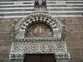 El edificio actual, que se encuentra construido sobre uno ya existente previamente, data de la segunda mitad del siglo XII. Consta de una nave y dos pasillos con ábsides. La fachada tiene una decoración mixta: piedra desnuda en la primera mitad y rayas blancas y negras en la parte superior. Además en la parte más alta existen dos falsas galerías, una encima de la otra, formadas por arcos y columnas sobrepuestos directamente sobre la fachada.