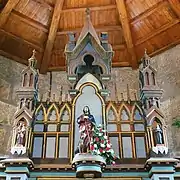 En ambos extremos del arco que conduce a la capilla mayor se ubican imágenes del Sagrado Corazón y la Inmaculada Concepción a izquierda y derecha, destacando, a su vez, el techo cónico de madera del ábside así como un reloj de pared situado junto a la talla de la Inmaculada, bajo la cual se encuentra un limosnero con una imagen de San Antonio de Padua, hallándose en las escaleras que conducen a la capilla mayor otro limosnero con una figura de la Virgen de Fátima, de la que hay otra imagen de mayor tamaño en el extremo izquierdo del transepto, frente al único confesionario del templo. Próximo al altar, en el crucero, se encuentran dispuestas varias otras imágenes religiosas: dos esculturas del Sagrado Corazón (un relieve y una talla de bulto redondo), una figura de la Virgen de Lourdes, una estatua de San Benito y un cuadro y una talla de la Virgen de Covadonga. A la entrada del santuario destaca un cuadro con la representación de la Última Cena, junto al que se encuentra una sencilla escalera de caracol que conduce a la tribuna.