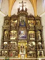 El elemento más interesante del interior del templo es el retablo mayor plateresco del siglo XVI, que no es el original que tuvo la iglesia sino una sustitución posterior a la Guerra Civil Española de 1936-39. El retablo primitivo fue un encargo de don Sancho al pintor de origen flamenco Juan de Flandes y consistía en ocho pinturas alusivas a pasajes evangélicos, que sí se conservan, aunque dispersadas: cuatro se encuentran en el Museo del Prado de Madrid y las otras cuatro en la National Gallery of Art de Washington D.C.. Este retablo fue destruido en 1761 y reemplazado por uno de traza barroca, en el que se montaron seis de las tablas de Juan de Flandes alrededor de un cuadro de Andrea del Sarto, La Virgen, el Niño y San Juanito, pintura conservada hoy en el Museo Diocesano de Palencia. Tras la Guerra civil, el retablo barroco fue desmontado y entonces se vendieron las pinturas.