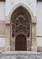 La composición gótica de la entrada consta de quince efigies colocadas en once nichos superficiales. En la parte superior se encuentran las estatuas de José y María con el niño Jesús, y en la parte inferior se pueden observar las de San Marcos y el león; los Doce Apóstoles están colocados en ambos lados de la entrada (cuatro estatuas de madera reemplazaron los originales que fueron destruidos). Por su composición artística y el número de estatuas, esta entrada es la más importante del gótico en el sur de Europa Central.