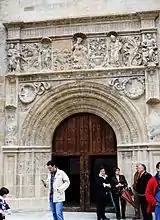 La renovación renacentista resulta más visible en la portada exterior del templo. De estilo plateresco, consiste en un arco de medio punto abocinado y volteado -de hecho, recuerda al muy anterior estilo románico- sobre el que corre un friso escultórico, y, enmarcándolo todo, dos pilastras y un entablamiento clásico. Esta portada, muy maltratada por el tiempo debido a la mala calidad de su piedra caliza, fue restaurada hace pocos años.