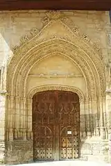 La torre, salvo el cuerpo inferior, que conserva la sillería medieval, fue reedificada en ladrillo macizo, al estilo mudéjar, adosada a la cabecera. La puerta principal de acceso se localiza en el lado de la Epístola (sur), y se abre al exterior a través de un elegante aunque deteriorado arco de estilo gótico-isabelino, con intradós carpanelado, tímpano vacío y trasdós conopial festoneado con cardinas y rematado en cogollo. Se halla este último elemento decorativo mutilado, al igual que las pilastrillas laterales, a las que les falta el cuerpo superior. En el pavimento del pórtico aparece una fecha, 1580. Se sabe que el maestro cantero Vítores trabajó en esta obra.