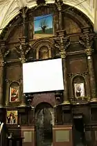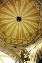 La planta es de tres naves, siendo más elevada la central que las laterales, y consta de seis tramos más una cabecera rectangular. Diez pilares de fuste prismático soportan unas cubiertas que la reforma barroca acometida en el siglo XVII convirtió en falsas bóvedas de arista, enlucidas y molduradas. El falso crucero, ante el Presbiterio y la Capilla Mayor, fue cubierto con una cúpula gallonada decorada con yeserías y apoyada sobre pechinas, en las cuales se colocaron relieves de cuerpo entero de los cuatro Evangelistas. Se considera al artista paredeño Felipe Berrojo de la Rúa autor de este trabajo.