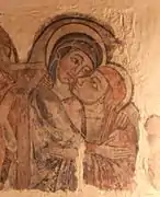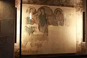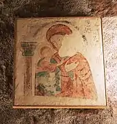 En 1954 se descubrieron unas pinturas a raíz de la restauración de la iglesia. Se encontraban en el arcosolio de la derecha del presbiterio, y son de temática mariana. Se fijaron sobre tela y, una vez terminada la restauración, se colocaron en un lugar diferente de la ubicación original, en el arcosolio de la izquierda, tras una protección de vidrio. Se trata de tres paneles, pintados a mediados del siglo XIII.[2] El mayor contiene dos escenas, una de la Anunciación y otra de la Visitación. El segundo en importancia es un anfisbena, una serpiente de dos cabezas, una a cada extremo. Es un símbolo de origen muy antiguo que se ha relacionado, en la Edad Media, con el catarismo. En este caso, aunque hay la posibilidad de que la fluidez de comunicación de esta zona con el Languedoc facilitara la presencia de cátaros en la región, cabe pensar más bien que es un símbolo relacionado con la Virgen (AVE María) que es el fin del pecado, contrapuesto con la primera mujer (EVA), iniciadora del pecado original.[3] El panel más pequeño es una imagen de la Virgen con el Niño, de clara influencia bizantina. Este conjunto pictórico se atribuyó inicialmente al Maestro de Lluçà, aunque estudios posteriores parecen indicar que fueron ejecutados por un taller de pintores neobizantinos.