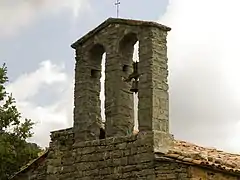 La cubierta exterior es a doble vertiente y de teja árabe. Encima del frontis, orientado a poniente, es coronado por un campanario de espadaña con dos largas ventanas cubiertas con un arco de medio punto. El arco del lado de mediodía tiene campana y el otro está vacío.