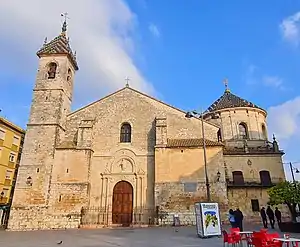 El templo posee tres portadas: la portada de la Virgen o de Umbría, orientada al norte, consta de un vano de acceso adintelado de perfil mixtilíneo sobre el cual se sitúa un frontón curvo en cuyo tímpano, bajo dosel calado gótico, figura una escultura de la Virgen con el Niño. La portada de San Miguel o del Sol, orientada al sur, es de composición similar a la anterior, aunque la cardina gótica que aparece como elemento decorativo en la de la Virgen, es sustituida aquí por grutescos renacentistas. Ostenta el escudo de la Casa de Comares flanqueado por figuras femeninas y en el tímpano la imagen de San Miguel.