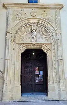La puerta que comunica el templo con la Sacristía, que se adosa al lado derecho de la cabecera, la compone un arco de medio punto, de cuya línea de impostas sube una moldura a modo de alfiz con decoración de frondas. En el centro figura el escudo de los Comares flanqueado por dos leones rampantes. La parte superior de la decoración fue destruida el siglo XIX para colocar una tribuna, hoy desaparecida. A los pies de las naves laterales se sitúan pequeñas capillas: la capilla bautismal, cubierta por bóveda gótica de crucería simple y capilla del Cristo de Burgos que tiene cúpula elíptica.