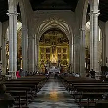Se trata de un templo de gran tamaño, con tres naves terminadas en la cabecera en sendas capillas cuadradas que se cubren con bóvedas de nervaduras. Tras la capilla mayor existe un pequeño ábside de planta rectangular, en el que se aloja el retablo mayor, cubierto también con bóveda de nervaduras cuyos plementos en piedra fueron pintados por Antonio Mohedano con motivos de ángeles. Los soportes son pilares de piedra arenisca, con planta rectangular y semicolumnas adosadas. Las arquerías que separan las naves tienen cinco arcos ojivales, enmarcados en alfiz rehundido, construidos en ladrillo.