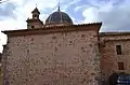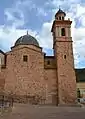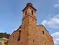 El campanario no está exento, formando parte de su planta cuadrada la fachada de la iglesia, a los pies de la planta, en el lado del evangelio. Presenta dos cuerpo y el remate en cupulín. El primer cuerpo, como hemos dicho, forma parte de la fachada y en él destaca el reloj de sol. El segundo cuerpo, en el que se sitúan las campanas, de fábrica de ladrillo, presenta ventanas semicirculares para alojar las campanas, que están enmarcadas por pilastras con capitel toscano. Por último, el remate formado por un cupulín de dimensiones reducidas y cubierto con tejas cerámicas.[1]