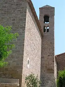 El campanario de la torre, prerrománico de torre cuadrada está constituido por tres pisos y con ventanas con los característicos arcos de herradura a cuatro caras, los cuales contenían unos capiteles corintios rústicos -hoy localizados en el Museo Comarcal de Manresa, donde se conservan cuatro capiteles. El campanario se trata de un prisma de 2,97 metros de lado x 15,80 metros de altura, las paredes internas del cual se adelgazan por medio de un escalón a 5,10 metros del suelo. Destaca por ser de construcción irregular, de piedras escuadradas a golpe de martillo en hiladas de altura desigual, unidas con mortero de cal y arena. Es originario del año 983, y conserva todas sus partes menos la cubierta.[2]