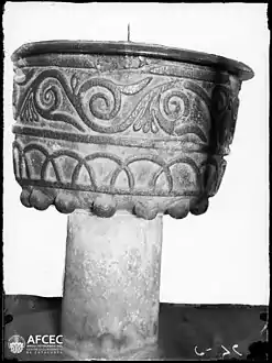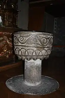 En el interior guarda una pila bautismal románica. Formada por un vaso cónico y un pie cilíndrico, con base circular. Tanto el pie cómo la base no corresponden al vaso. La pila está surcada por tres filetes horizontales que compartimentan la superficie del vaso en dos franjas. En la superior está representado un motivo vegetal y en la inferior hay grabados una sucesión de arcos. El ángulo inferior de la pila está bordeado de botones semiesféricos. Tanto el pie cómo la base carecen de motivos ornamentales: son lisos.[1] Está esculpida con motivos vegetales y geométricos de influencia mozárabe.