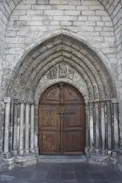 La actual puerta de acceso al templo data de finales del siglo XIII o principios del XIV. Fue añadida al templo románico existente. Recuerda mucho la de la vecina de San Esteban de Betrén, si bien está mucho más deteriorada. En ella se combinan las líneas apuntadas del incipiente estilo gótico con la temática y simbología románicas. Está formada por cinco arquivoltas apuntadas en gradación, donde hay esculpidas 59 figuras, referentes a la Resurrección, las imágenes inferiores, y a la Vida Eterna, las superiores. Podemos ver ángeles, santos, músicos y los apóstoles disfrutando de la Gloria, mientras que en las figuras más próximas a los capiteles observamos varios personajes salientes de sus sepulcros. La portada está protegida por un atrio que forma el primer piso de la torre del campanario, tal como sucede en la iglesia de San Martín de Gausach.