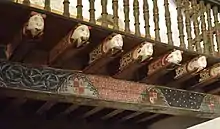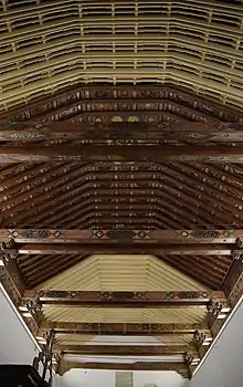 El alfarje del coro se conforma de 16 de vigas (jacetas) que reposan sobre un viga maestra en la zona central.[8] Los extremos delanteros (canes) están decorados con cabezas antropomorfas.