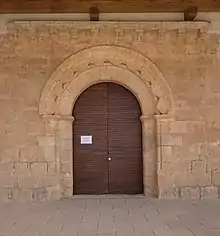 La portada de la iglesia es de estilo románico tardío y está fechada en la segunda mitad del siglo XIII. Al contrario que otras iglesias, solo existe una portada en este templo, en su lado sur. En la portada hay un arco de medio punto de doble arquivolta. La arquivolta interior es lisa y descansa únicamente sobre las dos jambas (no hay dintel), mediando únicamente una sencilla moldura que marca la línea de imposta. La otra arquivolta está formada por una baqueta sobre la que se apoya un festón de dientes de sierra que parece cisterciense, enmarcado todo esto por una chambrana lisa.