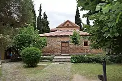 La iglesia fue construida originalmente como un simple edificio de un solo pasillo con un techo de madera a dos aguas. Más tarde se añadieron naves laterales en tres lados. Forman un ambulatorio, bajo cuyo suelo se han encontrado varias tumbas. La mampostería presenta capas irregulares de ladrillo y piedra, con algunas cerámicas en el lado este y decoración de ladrillo en los lados este y oeste. En el interior, el pasillo central está conectado a los otros con dobles aberturas decoradas con capiteles reutilizados de la antigüedad tardía. Se conserva el templón de mármol original.[1][2]