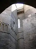 Los primeros cuerpos no son visibles desde el exterior, pues están inmersos en la iglesia. Se pueden apreciar desde la Claustra, y destaca un friso de arcos de medio punto entrecruzados, de tradición árabe.