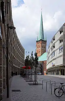 El campanario mide 108 m y, desde 1908, se puede acceder a la parte superior. Se puede subir en ascensor a la plataforma de observación que se encuentra a una altura de 50 m. Desde allí hay una vista panorámica de todo el casco antiguo y de los alrededores de la ciudad hasta la bahía de Lübeck. Véase también: Lübeck#Geografía.
