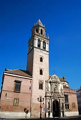 La fachada principal, en la calle Santa Ángela de la Cruz, es de 1612, atribuida a Vermondo Resta, formada por un arco de medio punto entre pilastras de tradición mudéjar, con 3 vidrieras circulares donde la central y más grande representa a San Pedro, y las de los lados a San Pablo y San José.