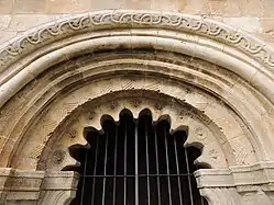 - En las reformas de los s. XV-XVI se añadieron las dos naves laterales y los ábsides de cabecera plana;[8] la portada románica, con arquivoltas con elementos decorativos vegetales,[9] se trasladó a la fachada sur.