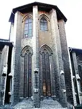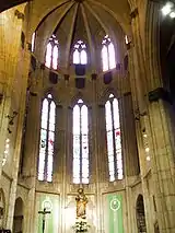 La cabecera está constituida por un ábside principal heptagonal y tres absidiolos pentagonales, uno a su lado derecho y dos al izquierdo, en los que se abren ventanales alargados, con arcos apuntados y baquetones en arquivoltas y jambaje. Presentan finos maineles y tímpanos calados por vanos trilobulados en la capilla mayor y por óculos tangentes floreados en las laterales. En el ábside de la capilla mayor existe además otra serie de ventanales superpuestos a los anteriores: son de menor derrame y tienen también parteluces y tímpanos abiertos por tres rosetas cuadrifoliadas. La esbeltez y elegancia de esta cabecera recuerdan la arquitectura de los templos de las órdenes mendicantes de Dominicos y Franciscanos.