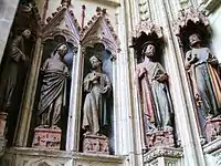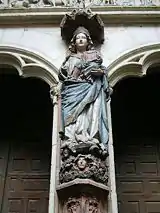 En la parte baja de la portada se apean las tallas policromadas de los doce apóstoles, cuatro de ellas situadas en las jambas y las demás discurriendo por los muros del pórtico. En el parteluz que separa las dos puertas enmarcadas por sendos arcos escarzanos con intradoses trilobulados se sitúa Santa María en majestad, también policromada, que pisa al dragón infernal y sostiene al Niño Jesús, hoy descabezado. Los bultos se apoyan en pedestales con relieves historiados y se cubren con pináculos truncados y gabletes. Son estatuas expresivas y naturalistas, de armónica elegancia, que recuerdan el estilo gótico de la Catedral de Amiens. El Pórtico se halla guarnecido tras una cancela de hierro y una malla para impedir pasar a las abundantes palomas que pueblan la zona.