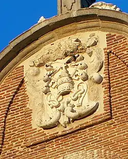En el lado de la epístola, portada neoclásica-jónica con escudo de San Pedro. En ambas fachadas existen dos cuadrantes con relojes de sol.