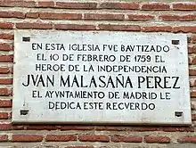 «EN ESTA IGLESIA FUE BAUTIZADO EL 10 DE FEBRERO DE 1759 EL HÉROE DE LA INDEPENDENCIA JUAN MALASAÑA PÉREZ - EL AYUNTAMIENTO DE MADRID LE DEDICA ESTE RECUERDO»