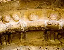 Hay dos con decoración vegetal, uno con dos aves enfrentadas y tres con representación historiada. En el primero de los capiteles historiados, a la izquierda del espectador, se representa la espera de dos nobles con grandes palmas entre las manos, elegantemente vestidos con pellizones -túnica más corta que el brial, con mangas estrechas que se abren al llegar a la altura de la muñeca y adornada con cenefas y bandas de influencia bizantina-,[7] para recibir a alguien; en el siguiente, un personaje sentado como si reposara del viaje (está destrozada la cabeza, pero posiblemente es el que se representa en la clave) es atendido por los dos caballeros, uno a cada lado, que le ponen una mano sobre los brazos. Y, por último, el mismo personaje de la clave (posible comitente o palaciano de la barbas con grandes rizos vueltos hacia fuera) está en una esquina recibiendo el homenaje de los otros dos personajes situados a su derecha, uno genuflexo le hace alguna ofrenda (¿el pan y la sal?) y el otro está de rodillas. Todos ellos, como hemos dicho, visten elegantes mantos o pellizones.[6]