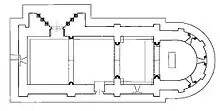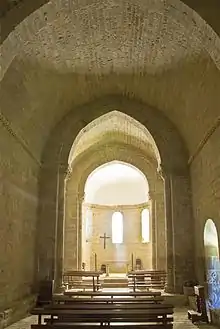 El templo se compone de un ábside semicircular con cubierta de horno, seguido de una nave de tres tramos rectangulares con bóveda de medio cañón apuntado sobre arcos fajones que descansan en columnas con capiteles decorados con temas vegetales (a excepción del que se encuentra en el arco triunfal en el lado del Evangelio donde podemos ver leones enfrentados) y, en el tramo próximo a la portada, historiados. Sobre ellos, siguiendo el perímetro de la nave, hay una imposta ajedrezada.